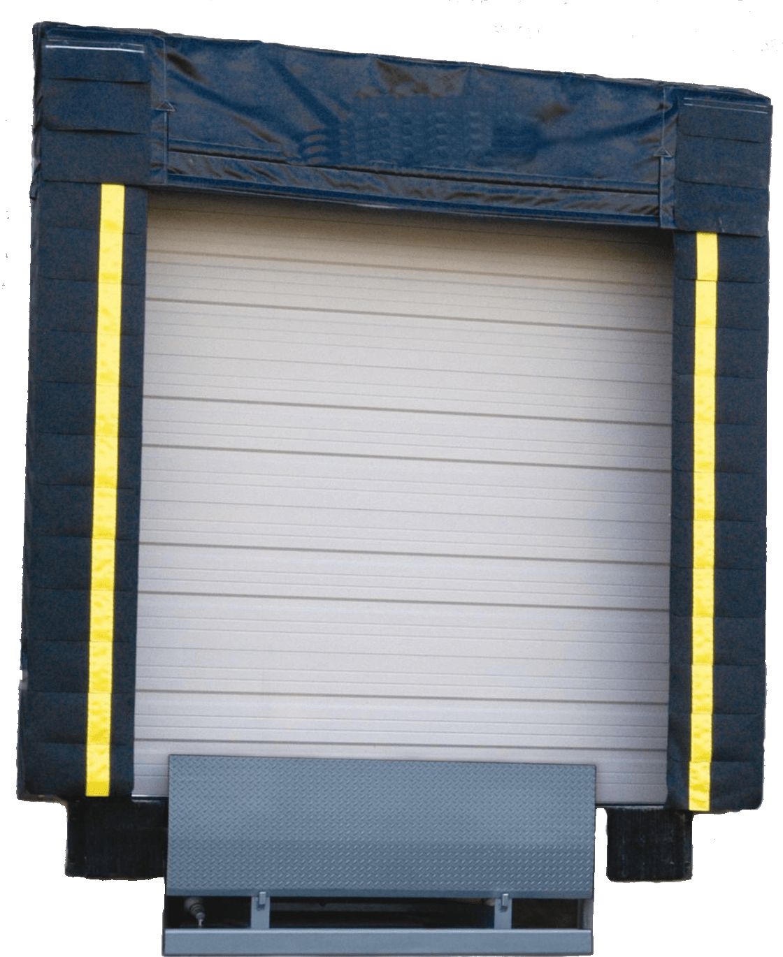 Sello de anden nacional fabricado con estructura de madera tratada de 4×2 con vinyl de 22oz con solapas de 40oz, amarillo reflejante y toldo antilluvia de 22 oz.